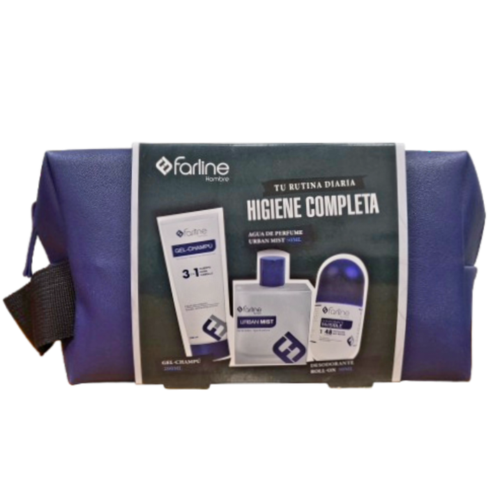 FARLINE HOMBRE RUTINA HIGIENE es un conjunto de productos diseñado específicamente para satisfacer las necesidades de higiene y cuidado diario de la piel masculina. Este kit incluye Gel-champú 3 en 1 de 200 ml, desodorant roll-on y Agua de Perfume 50 ml que ayudan a mantener la piel fresca, limpia y perfumada, permitiendo una rutina de limpieza eficaz y fácil de seguir.