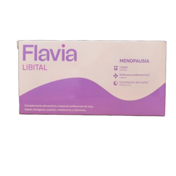 Flavia Libital es un complemento alimenticio formulado para contribuir al bienestar y equilibrio hormonal de la mujer. Su composición única incluye ingredientes de origen natural como el azafrán que estimula la libido, el lúpulo y la melatonina que ayudan a aliviar síntomas asociados con la menopausia, tales como los sofocos, sudoración y la dificultad de conciliar el sueño.