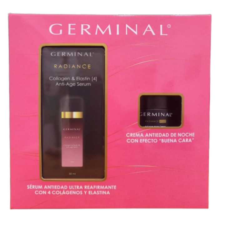 El Germinal Radiance Collagen & Elastin Anti-Age Serum es un sérum antiedad que contiene 4 tipos de colágeno y elastina, proporcionando una ultra firmeza y elasticidad. Está indicado para todo tipo de pieles a partir de 40 años y es ideal para quienes se preocupan por el envejecimiento prematuro de la piel, así como por la falta de firmeza y elasticidad. Este sérum aumenta la firmeza y la elasticidad de la piel, evitando la flacidez y el descolgamiento. Además, estimula y genera colágeno, estabilizando el colágeno existente.